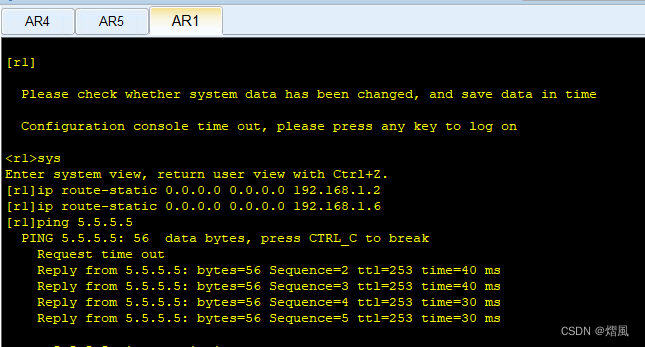 [r4]ip route-static 0.0.0.0 0.0.0.0 192.168.1.22 preference 61