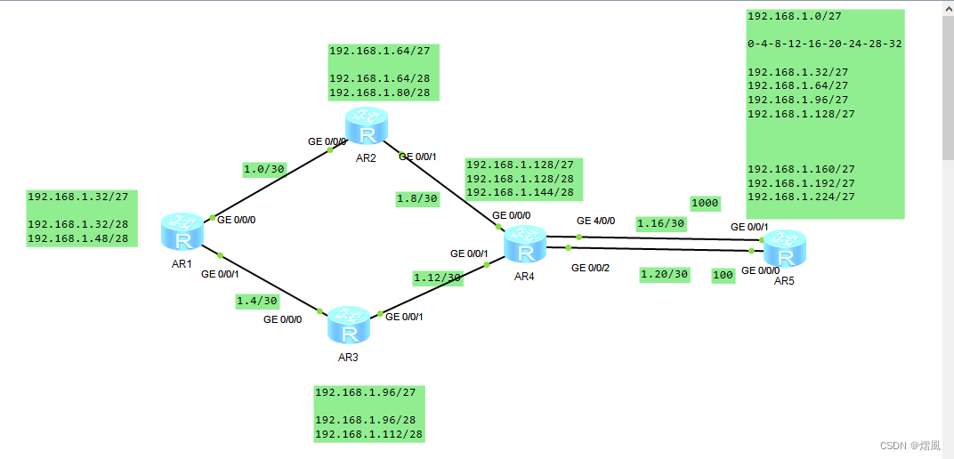 1.除R5的环回地址以固定外,整个其他所有的网段基于192.168.1.0/24进行合理的IP地址划分