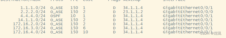 结果如下(172.16.1.0/24 deny 172.16.2.0/24 type 1 172.16.3.0/24 cost 6 172.16.4.0/24 type 1 cost 9)