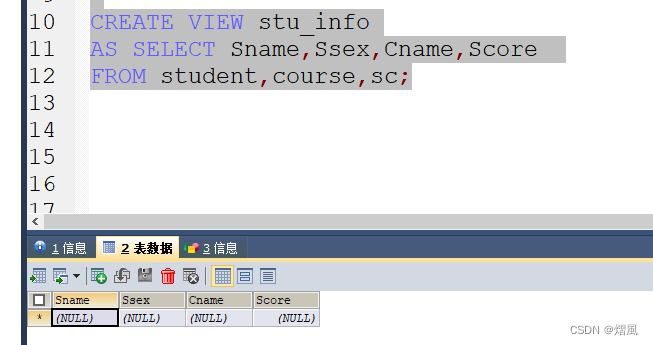 4.创建-视图 stu_info,查询全体学生的姓名,性别,课程名,成绩。