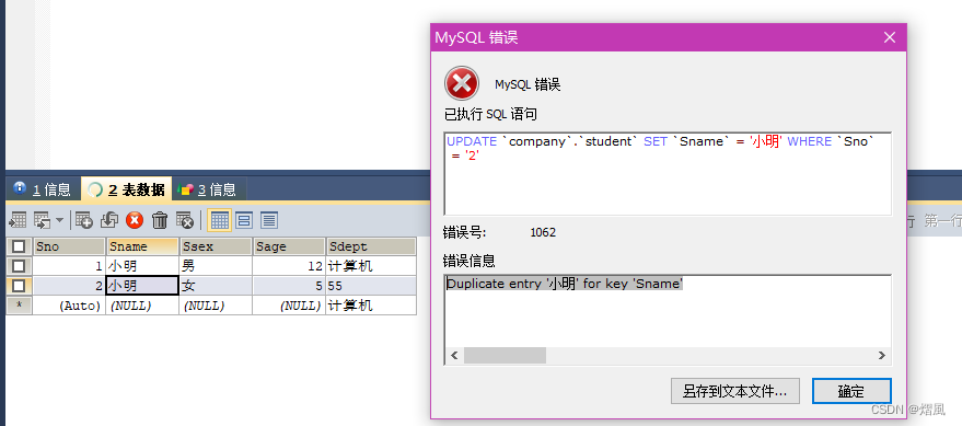 1.用SQL语句创建学生表student,定义主键,姓名不能重名,性别只能输入男或女,所在系的默认值是“计算机”。