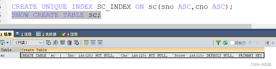 3.为SC表建立按学号(sno)和课程号(cno)组合的升序的主键索引,索引名为SC_INDEX 。
