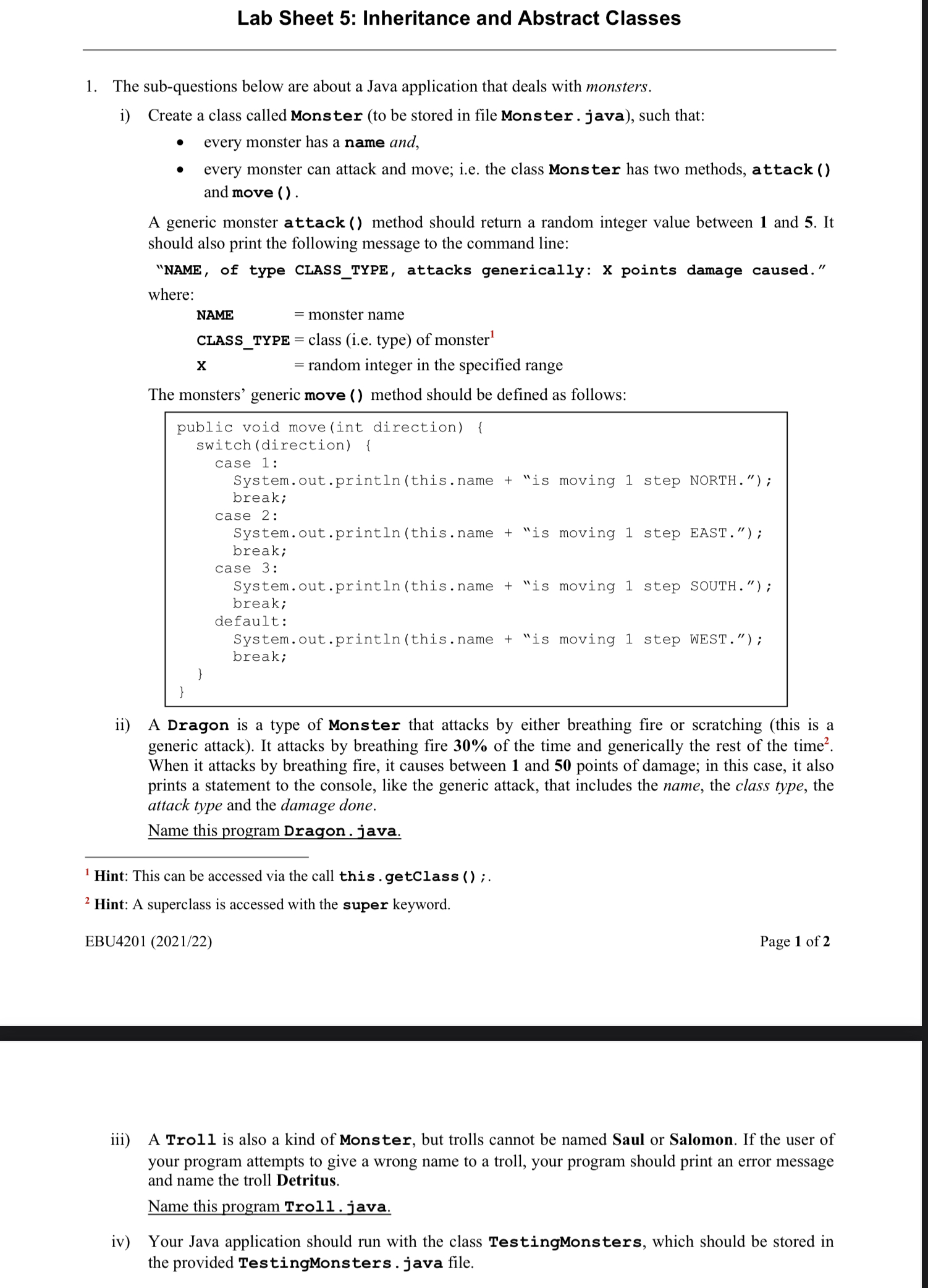 这个博客展示了如何使用Java编程创建一个怪物战斗模拟器。`TestingMonster`类管理一组怪物,包括`Monster`、`Dragon`和`Troll`子类。每个怪物有不同的攻击和移动行为。`Dragon`有概率喷火造成高伤害,而`Troll`在初始化时会检查名字。程序通过循环战斗直到总伤害达到100。