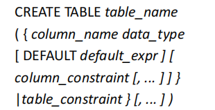 CREATE TABLE table_name( { column_name data_type[ DEFAULT default_expr ] [column_constraint [, ... ] ] }|table_constraint } [, ... ] )