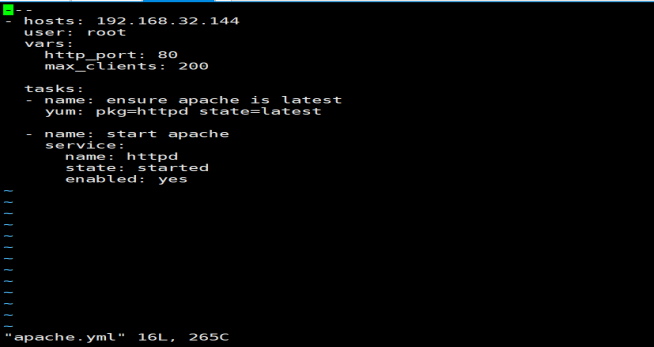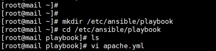 首先创建/etc/ansible/playbook目录,在该目录下添加apache.yml文件,此文件就是一个playbook.