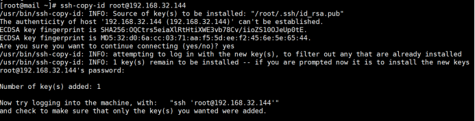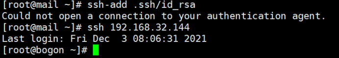 公钥下发完毕后,使用ssh-add命令将私钥交由192.168.32.144管理,在命令执行完毕后,在执行ssh命令验证配置是否成功.