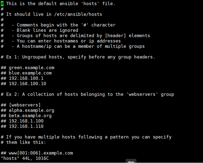 主机目录的配置文件默认是/etc/ansible/hosts,查看该文件,可以看到如下部分内容: