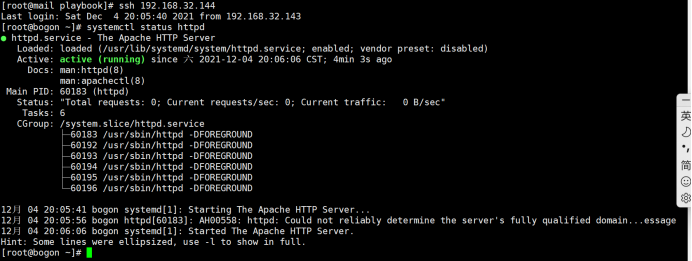 之后用ssh命令登录192.168.32.144查看httpd服务是否成功安装与启动.具体结果如下: