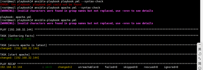 定义好apache.yml文件后,使用命令查看文件是否有错误并调用ansible-playbook命令执行该文件.具体命令与执行结果如下: