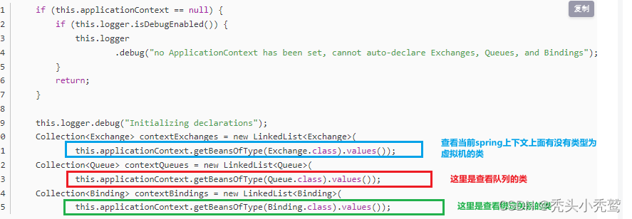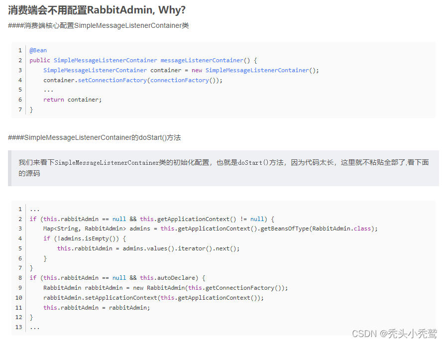 因为消费者在调用@RabbitListener的时候,会触发SimpleMessageListenerContainer对RabbitAdmin进行初始化注入到spring容器里面去。