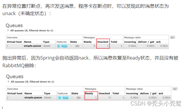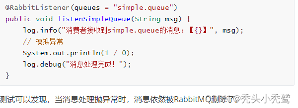 而默认情况下,消费者调用失败之后,消息会重新进入requeue队列里面去,然后重新发送给消费者去进行消费(失败重试机制)因为本来消费者里面的方法的方法体本来就是错误的,就会不断的报错。