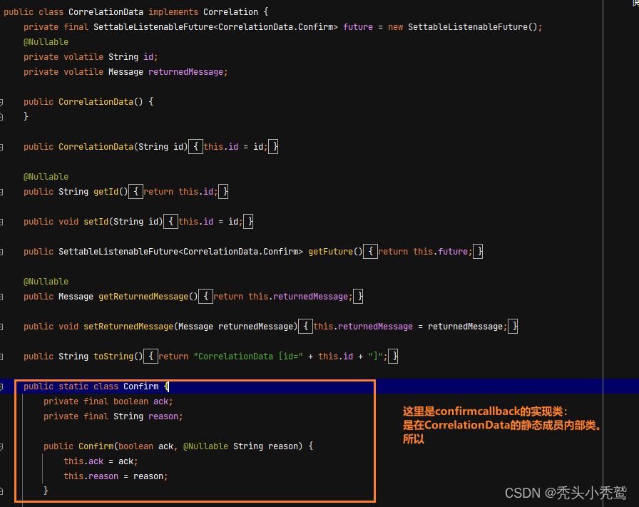 这里涉及到一个新的api:CorrelationData,他是一个实现ConfirmCallback接口的实现类,以及他还是给消息定义唯一id的数值。我们来看以下CorrelationData的源代码: