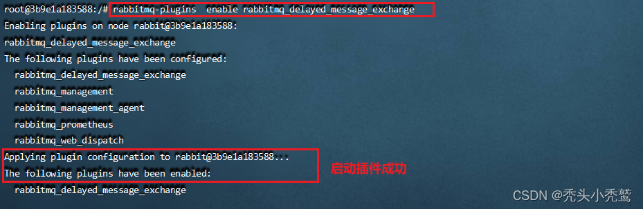 进入容器 输入命令:rabbitmq-plugins enable rabbitmq_delayed_message_exchange