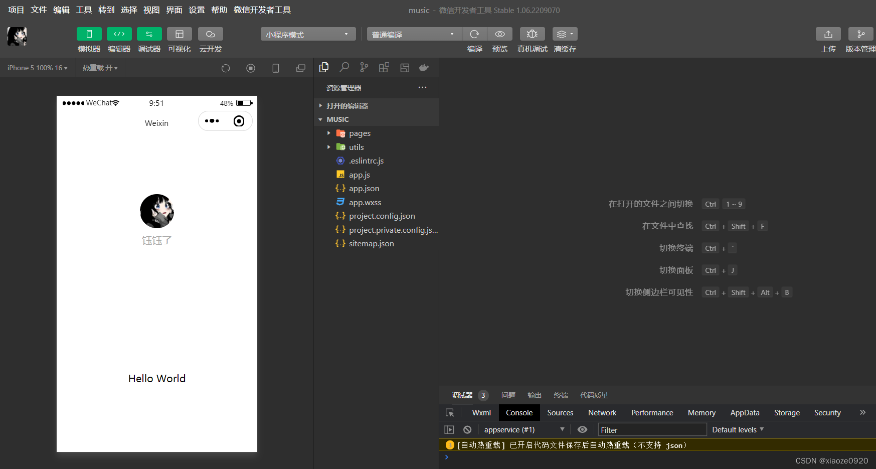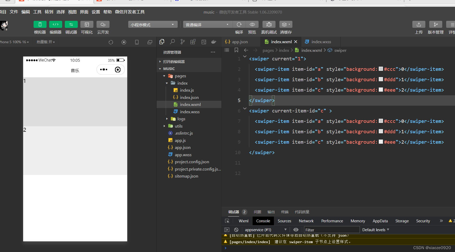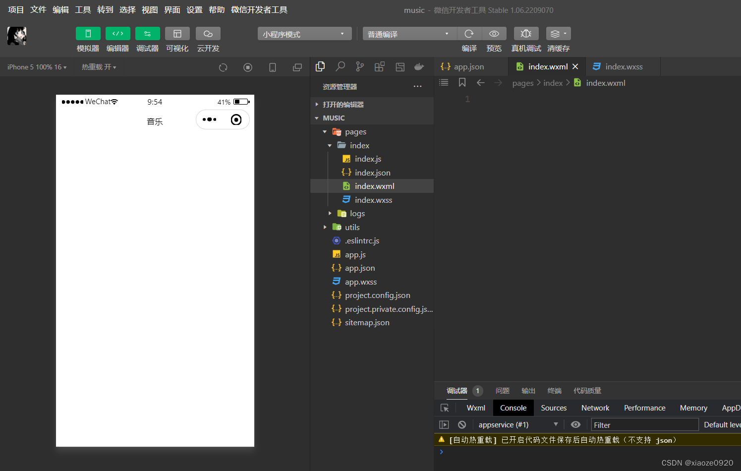 app.json,标题导航栏名称改为"音乐"{ "pages":[ "pages/index/index" ], "window":{ "backgroundTextStyle":"light", "navigationBarBackgroundColor": "#fff", "navigationBarTitleText": "音乐", "navigationBarTextStyle":"black" }, "style": "v2", "sitemapLocation": "sitemap.json" }