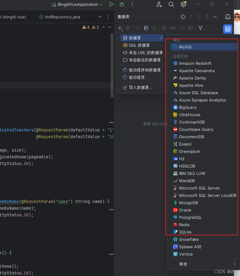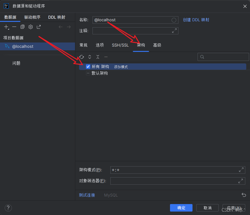 打开你的IDEA,直接选择数据库 打开选型,选择数据库类型(如MySQL等) 选定之后填入账号密码等信息,其他的默认即可,然后测试连接(如果没有下载MySQL驱动一定要在IDEA提示的地方下载驱动) 在架构处选中所有的架构,其他的不用勾选,然后点击应用后在点击确定即可 然后选中你要查看的数据表即可显示出来