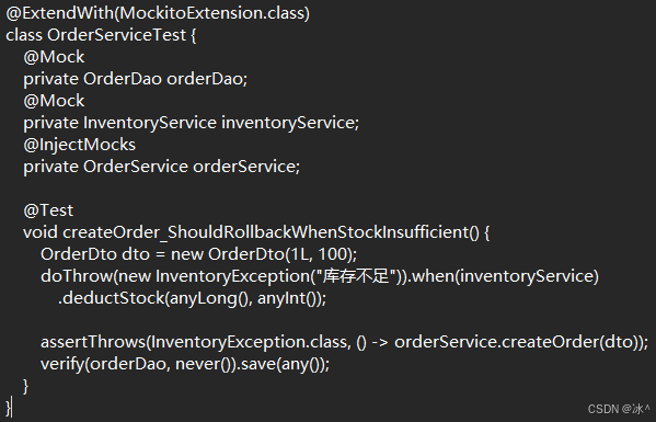使用 Mockito 模拟依赖,验证 Service 逻辑: