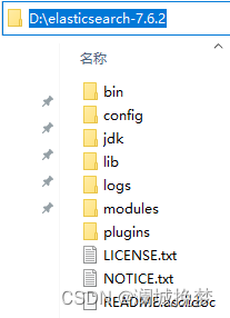 无论使用哪种操作系统,只需要下载elasticsearch的压缩包并解压即可使用,需要注意,elasticsearch文件夹的各层级的父级文件夹的名称中不允许包含非ASCII码字符和空格!例如放在D盘根目录下: