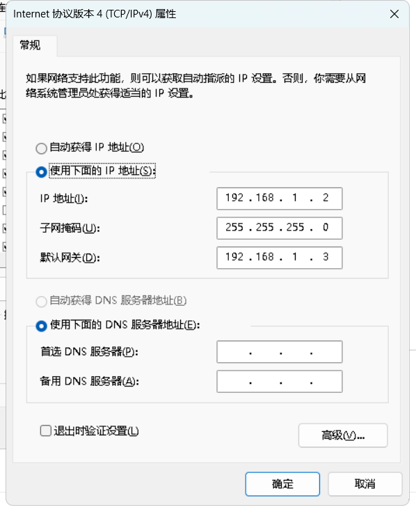 win+r 输入control 打开控制面板,选择“网络与共享中心”—“更改适配器设置”—“以太网”(这时显示网线断开不要慌,因为只有设置完jetson的静态ip才会连接成功)—右键“属性”—双击“TCP/IPv4”,设置为如下模式。此时本地ip为192.168.1.2,默认网关设置为同频段下不同地址。