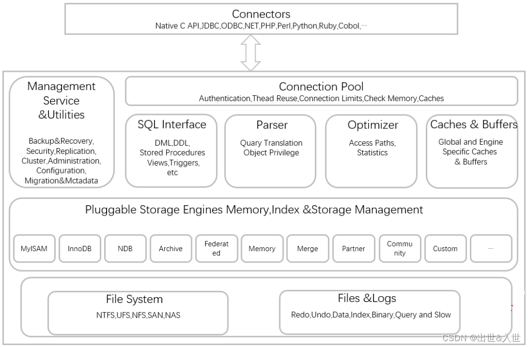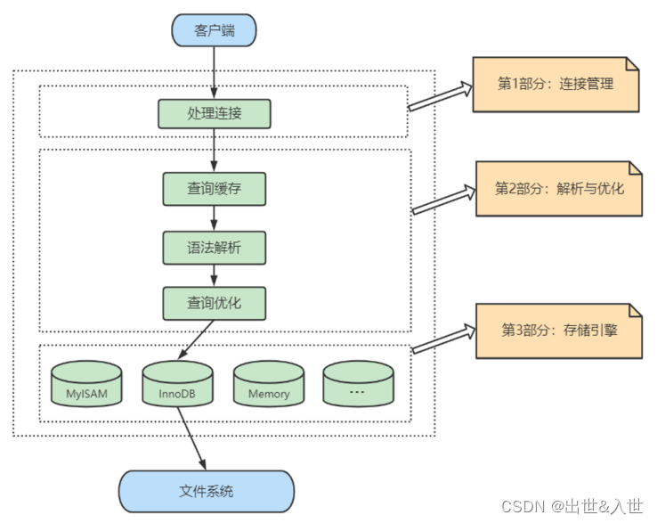所有的数据、数据库、表的定义、表的每一行的内容、索引,都是存在文件系统 上,以文件的方式存在,并完成与存储引擎的交互。