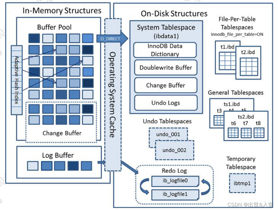表空间:分为系统表空间(MySQL 目录的 ibdata1 文件),临时表空间,常规表空间,Undo 表空间以及 file-per-table 表空间(MySQL5.7默认打开file_per_table 配置)。系统表空间又包括了InnoDB数据字典,双写缓冲区(Doublewrite Buffer),修改缓存(Change Buffer),Undo日志等。