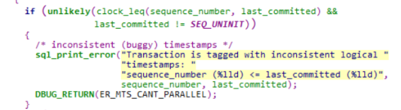 2023-05-14T05:09:48.526341Z 12 [ERROR] Transaction is tagged with inconsistent logical timestamps: sequence_number (7870797233) <= last_committed (2957740090370948108)