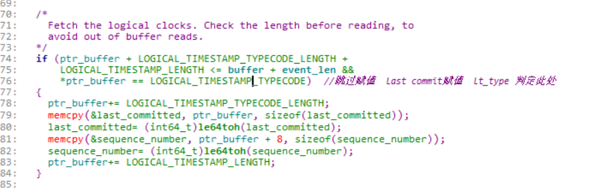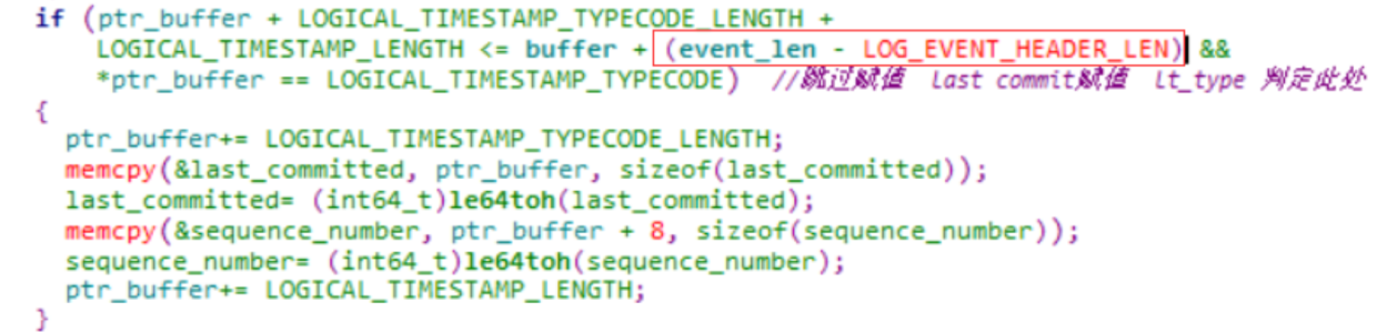 LOGICAL_TIMESTAMP_LENGTH <= buffer + event_len的含义是,如果本次获取的gtid event的长度小于5.7格式的gtid event的长度就不要执行last commit和seq number的赋值,因为5.7的gtid event 包含了16字节的last commit和seq number,还包含了1字节的typecode,总共比5.6的gtid event 大17字节。