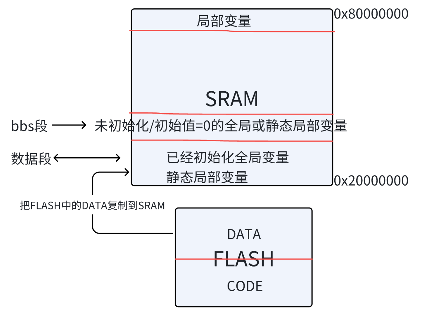 BSS 段:存放未初始化的全局变量和初始化为 0 的静态变量。