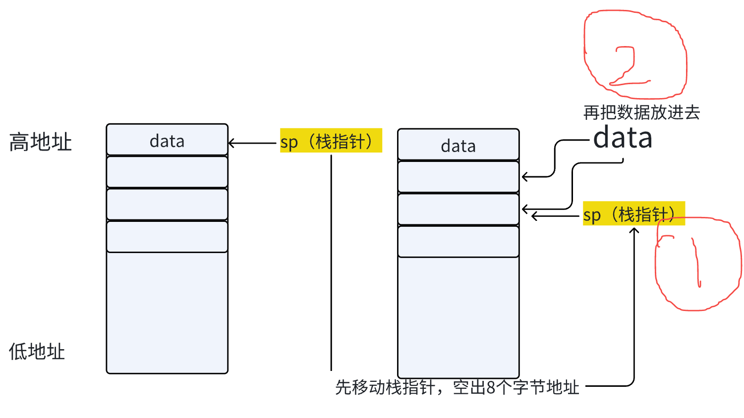int类型的局部变量,在 32 位 ARM 架构下,int通常占 4 个字节,那么这两个局部变量共需 8 个字节。 -