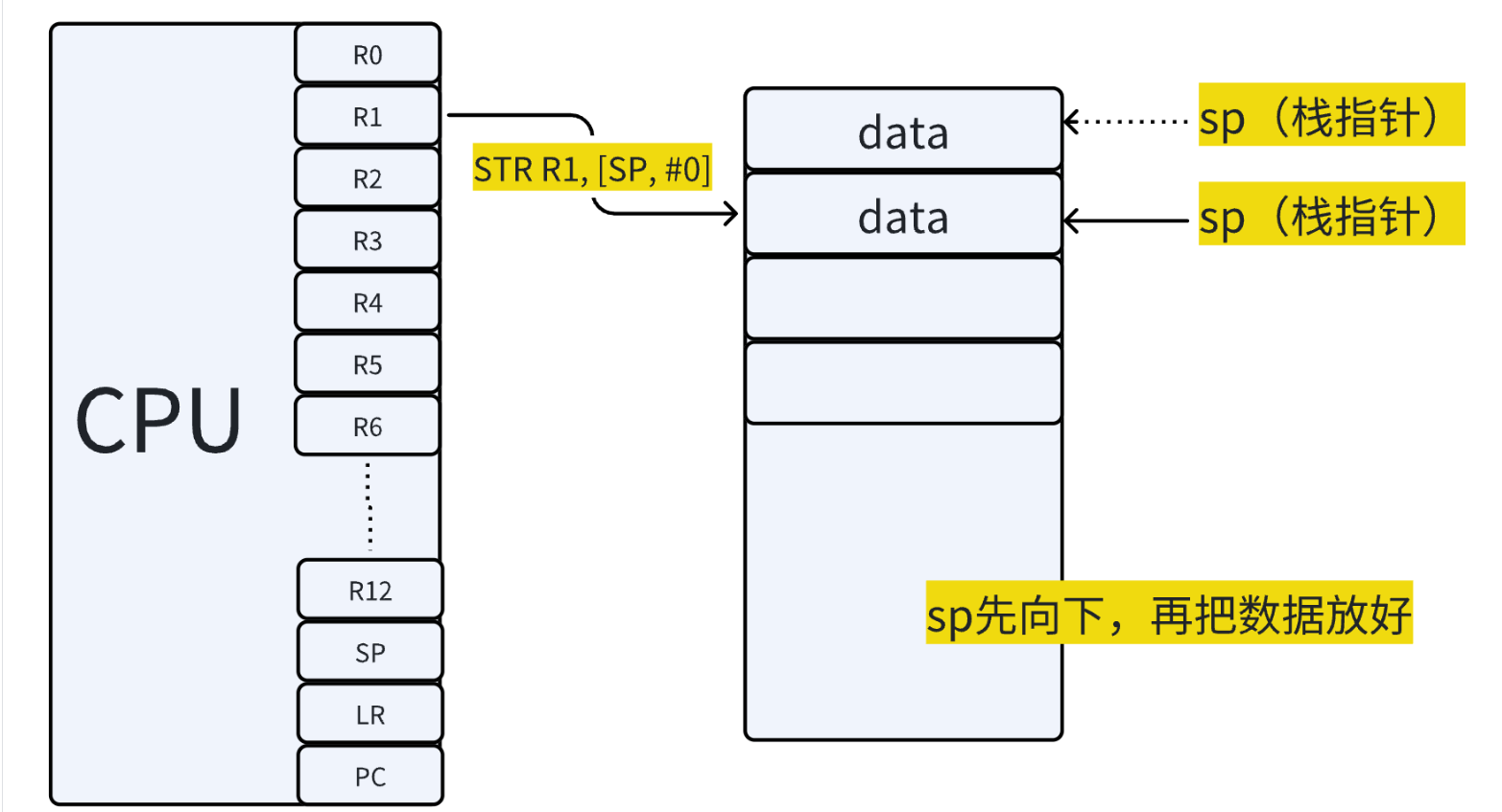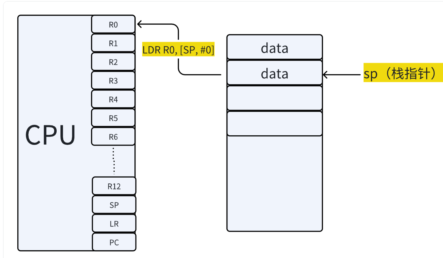 SP(Stack Pointer)。在 ARM 架构中,栈通常是 “满递减栈”(栈向低地址增长,且 SP 指向当前栈顶的有效数据,先移动 SP,再存数据),即栈指针SP初始时指向栈空间的高地址,随着数据入栈,SP的值逐渐减小。