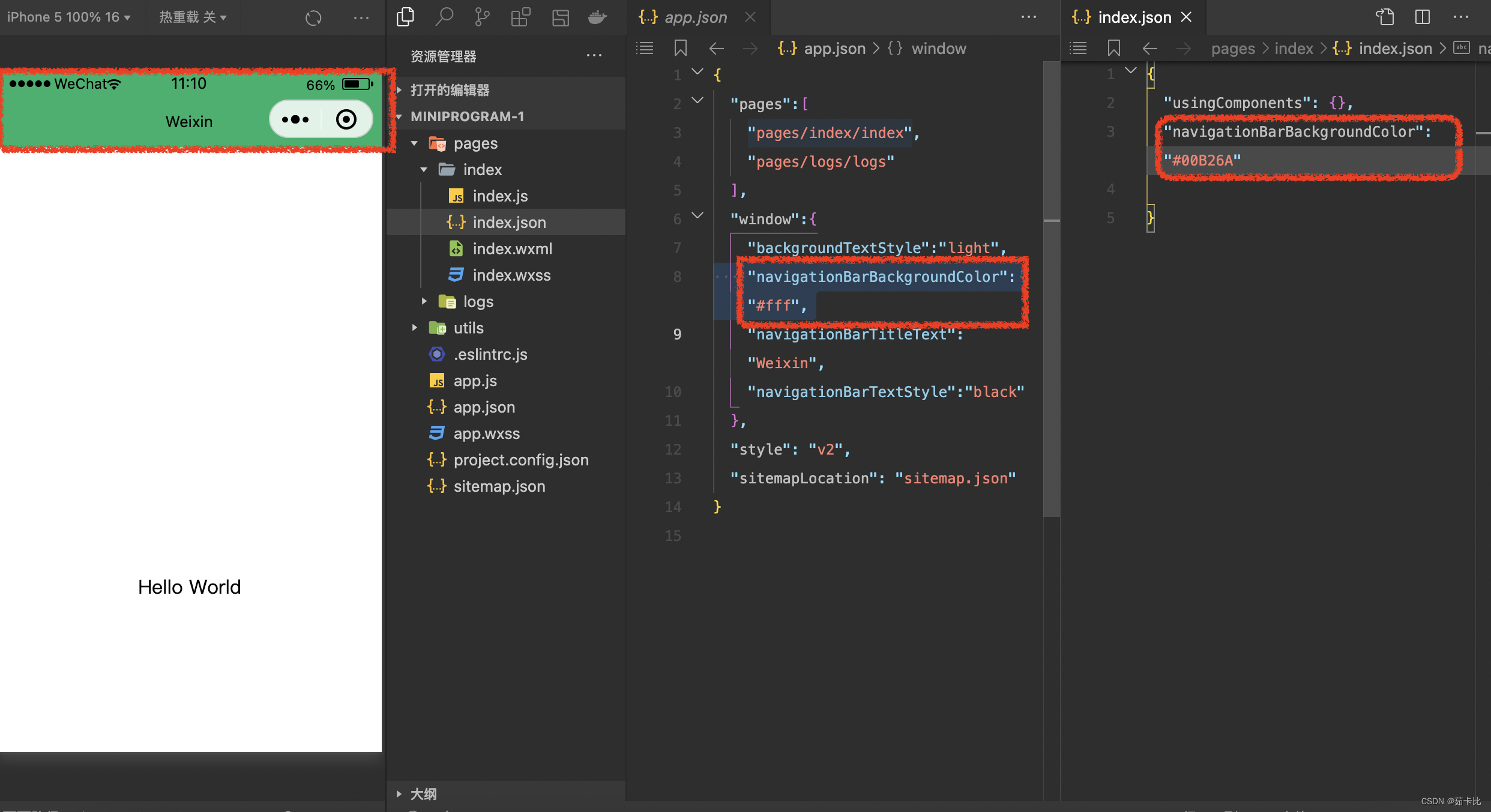 小程序中的每一个页面,可以使用.json文件来对本页面的窗口外观进行配置,页面中的配置项会覆盖app.json的window中相同的配置项