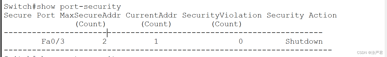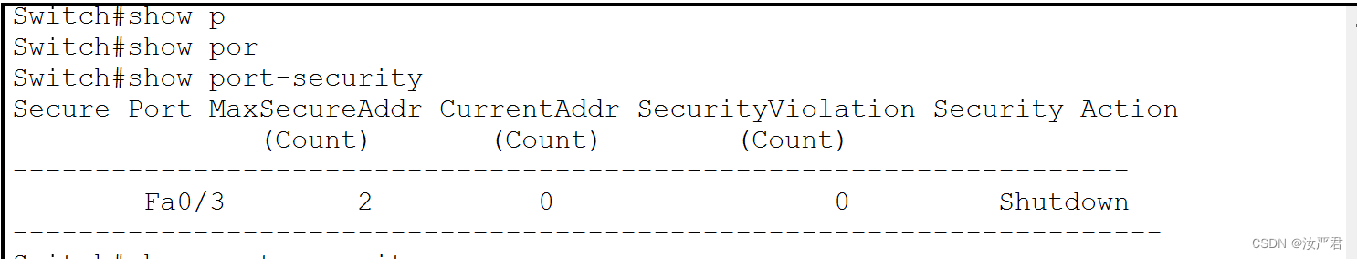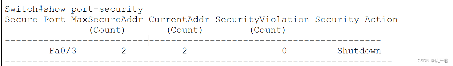 Switch(config-if)#switchport port-secruity maximum 2:配置端口的最大连接数为2