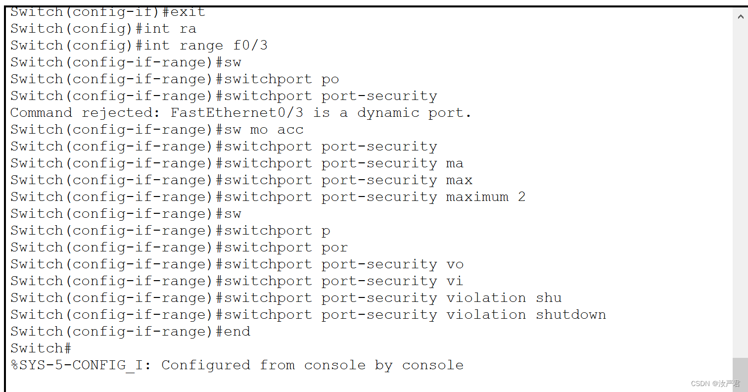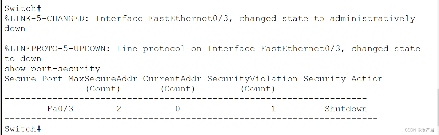 Switch(config-if)#switchport port-secruityviolation shutdown:配置安全违例的处理方式为 shutdown