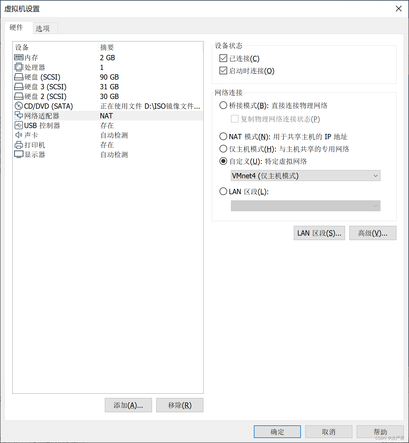 我们来设置一下DHCP客户端,把另一台虚拟机也设置为仅主机(两台虚拟机要设置为同一个虚拟网卡,目的是保证在同一个局域网中)