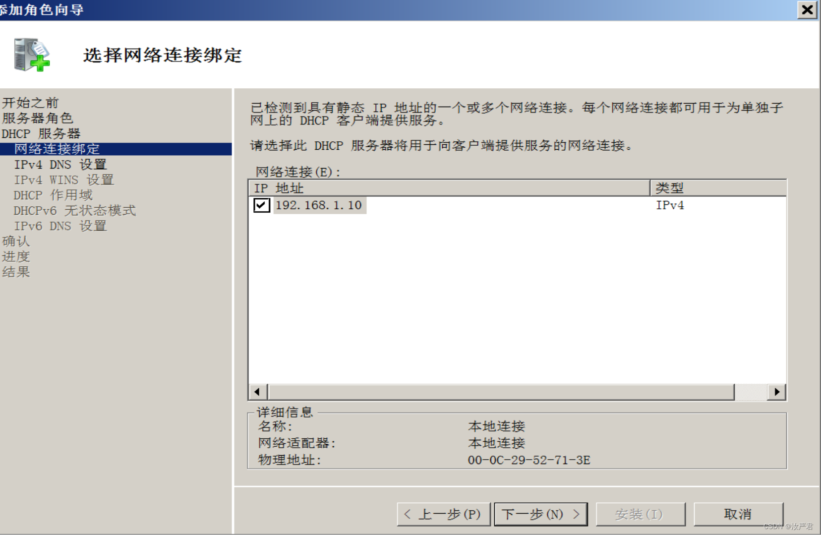 进入选择网络连接绑定,勾选IP地址;安装程序将自动检查你的服务器是否具有一个静态IP地址,第2步设置了则会被检测显示出来。
