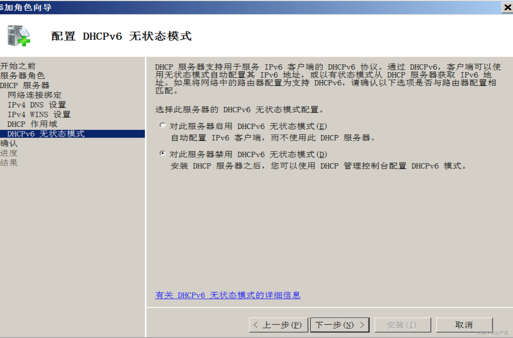 DHCPv6无状态模式,选择禁用模式;在Windows Server 2008中默认增加了对下一代IP地址规范IPv6的支持,不过就目前的网络现状来说很少用到IPv6,因此可以选择对此服务器禁用DHCPv6无状态模式。