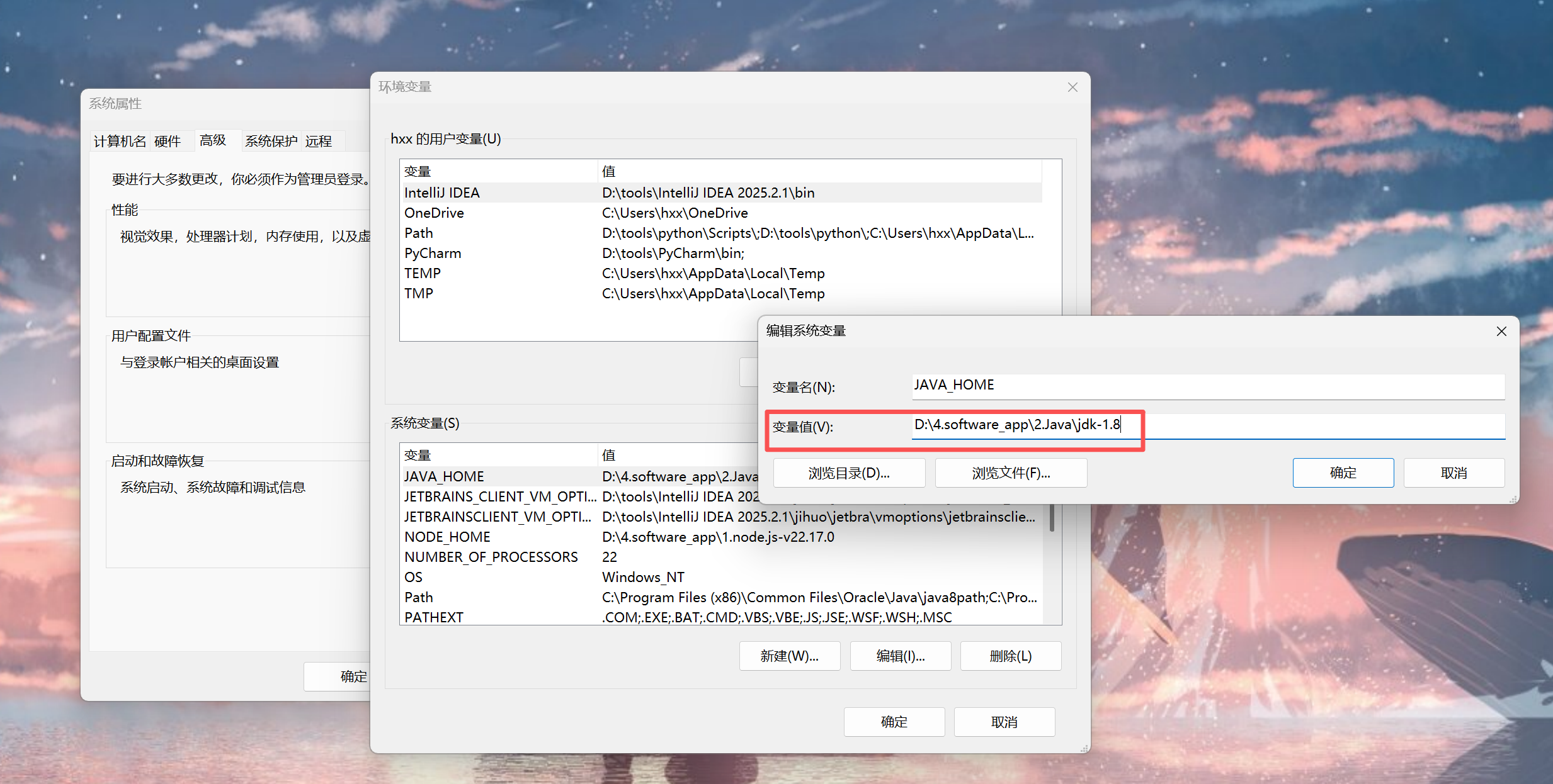 注---------安装多个jdk版本时,切换jdk生效版本,可通过修改“JAVA_HOME”的变量值(选择需要生效的JDK版本)即可,例如jdk1.8