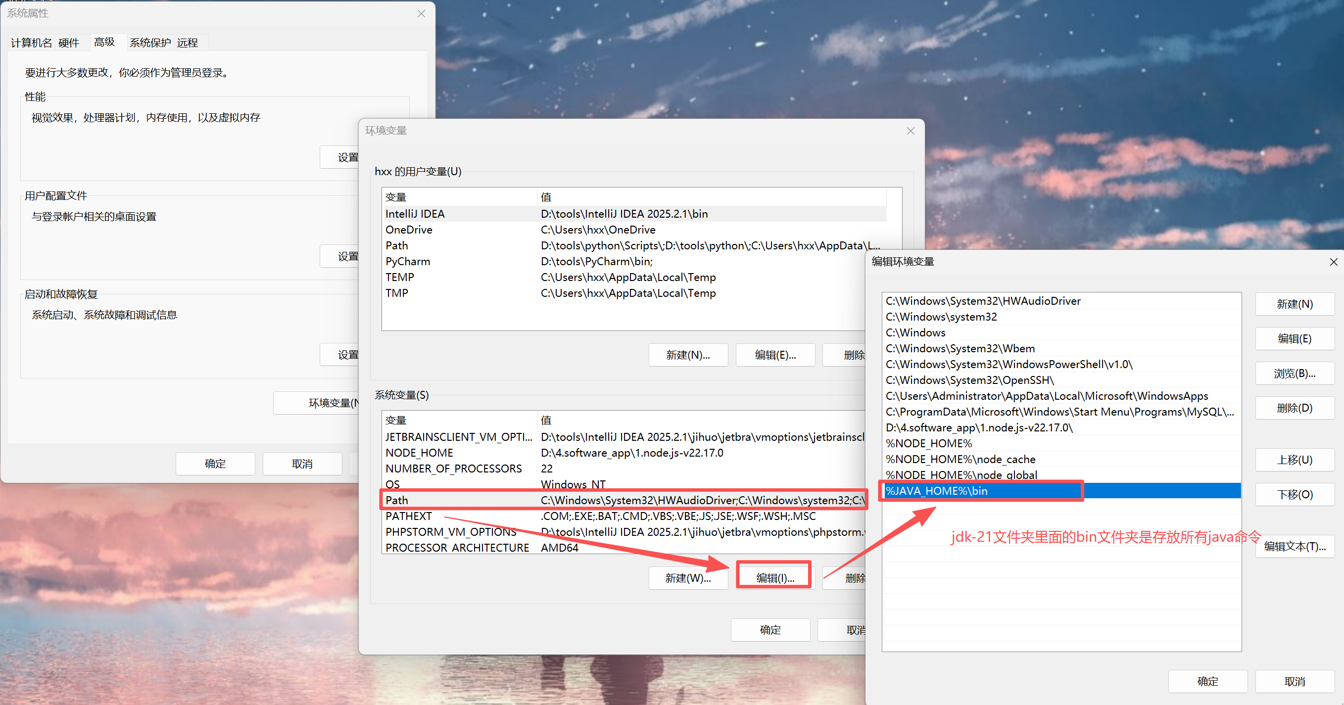 3.在"系统变量"-“path”添加JAVA_HOME的环境信息,最后全部点击“确定”按钮并重新打开命令窗口去查看JDK版本。