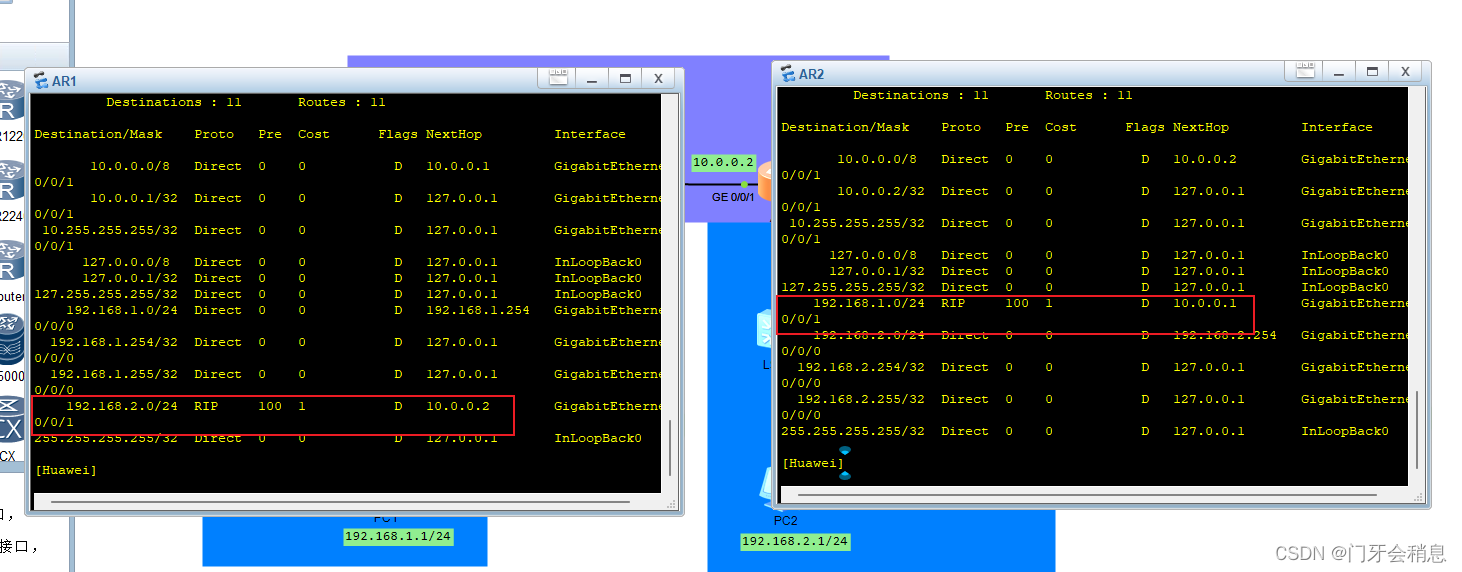 两路由器交换相应的路由表信息,分别知道了到达另一网段的下一跳地址(next hop)是多少