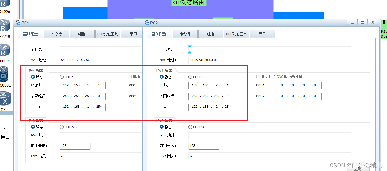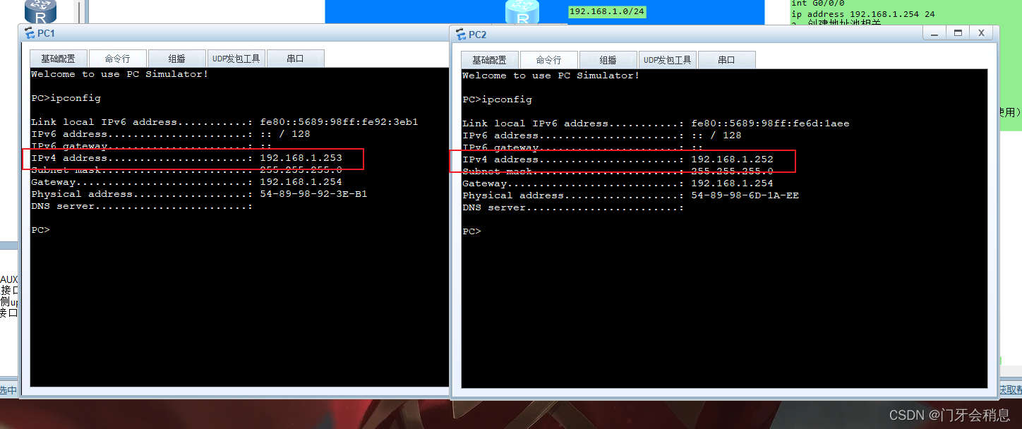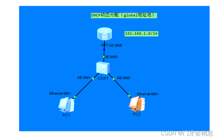 要实现的效果就是在路由器充当DHCP服务器,在路由器中中配置一个IP地址池,然后两台PC设置成动态IP模式从地址池中获取IP