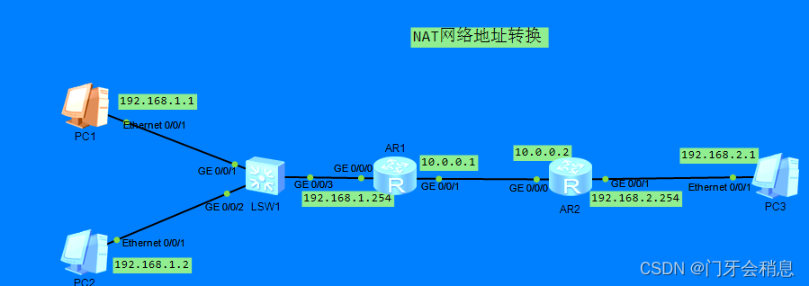 用PC1去PING AR2的GE0/0/0端口(现在是PING不通的,没有添加路由信息,但是数据包可以到达AR2),可以抓包查看PC1和外部通信使用的IP地址发生变化