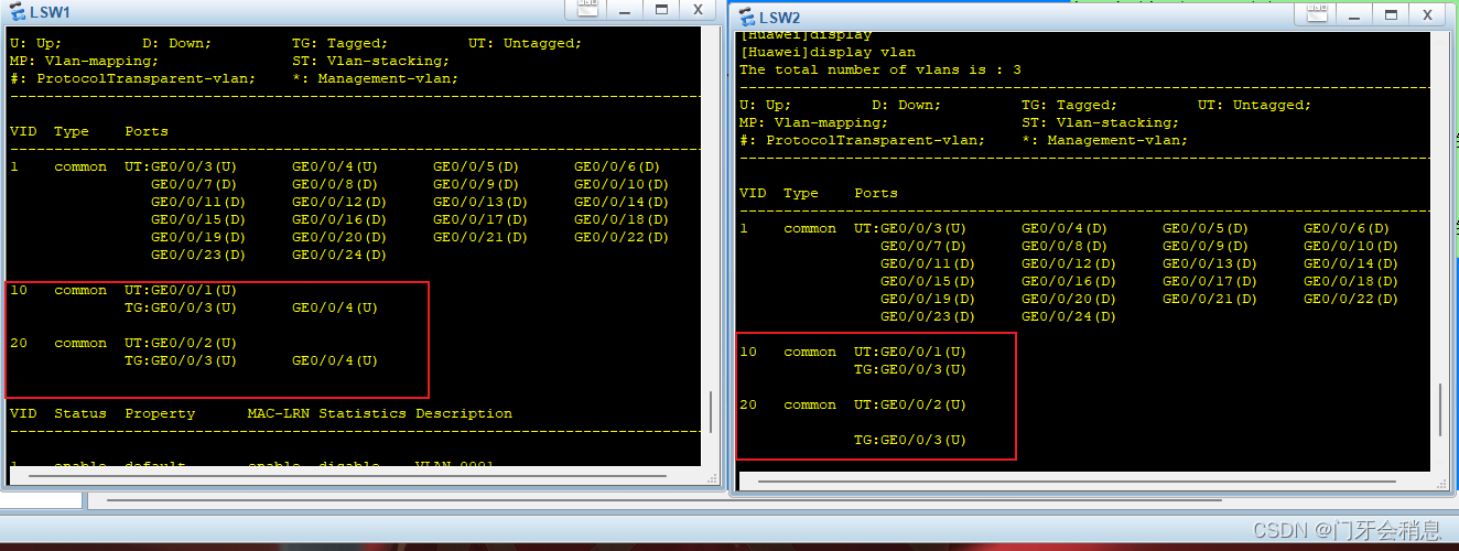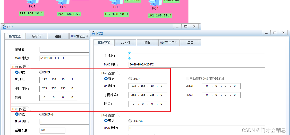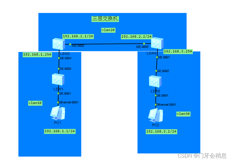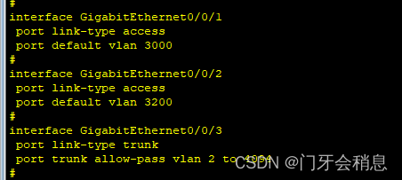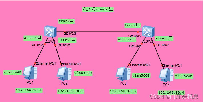 PC1、PC3(vlan3000),PC2、PC4(vlan3200)。交换机和PC直接相连的口设置成access,交换机之间相连的口设置成trunk。最终实现PC1和PC3之间通信,PC2、PC4之间通信。