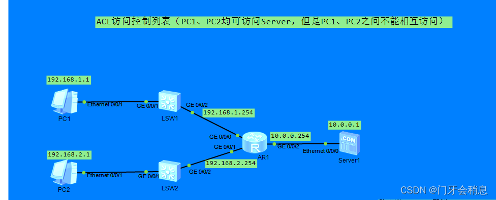 最终实现的效果 :PC1、PC2均可访问Server,但是PC1、PC2之间不能相互访问