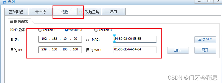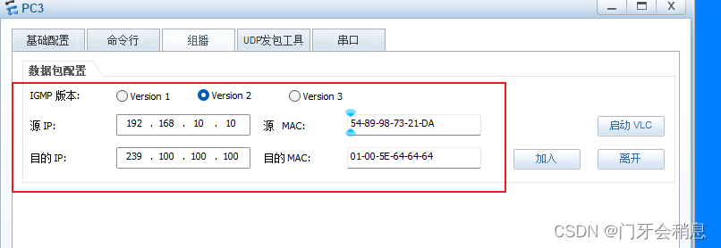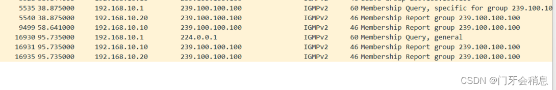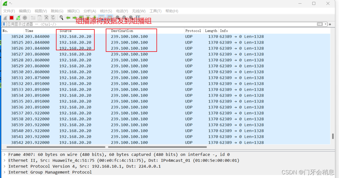 先播放组播源然后再让PC加入组播组,通过Wireshark抓取PC1的数据包,下面是PC加入组播组的流程和组播数据
