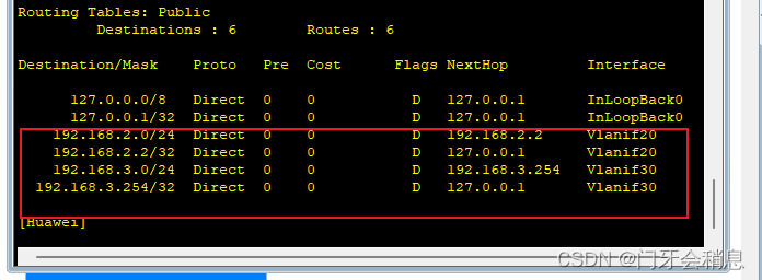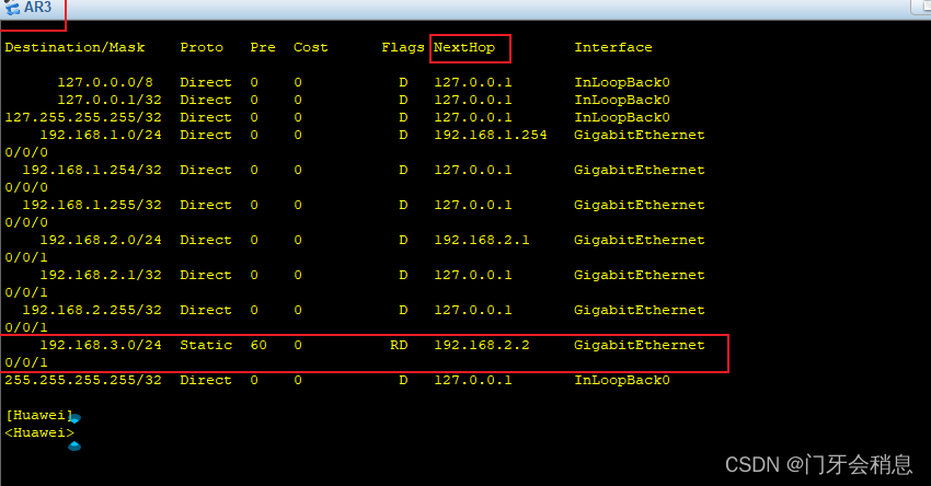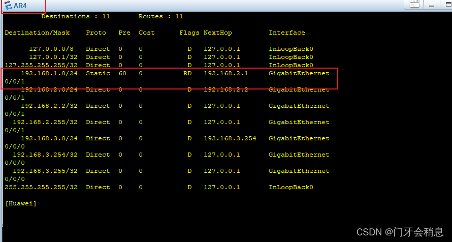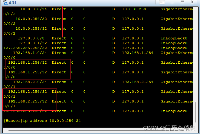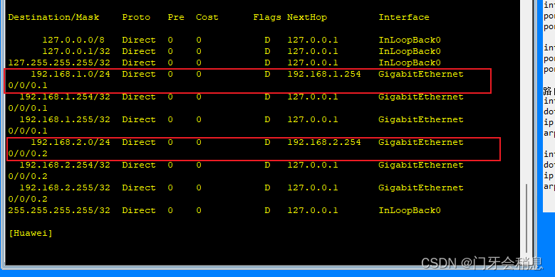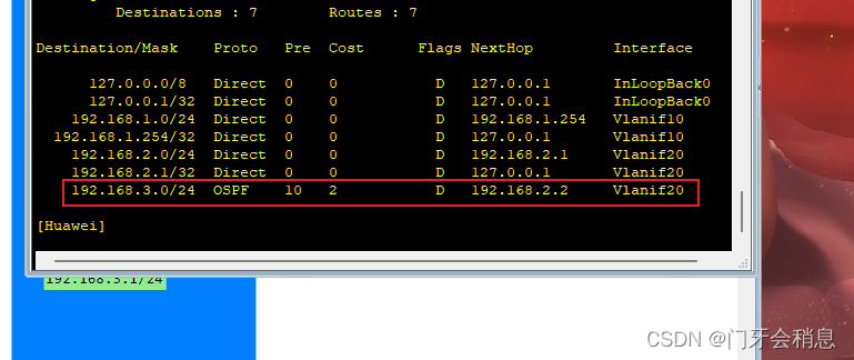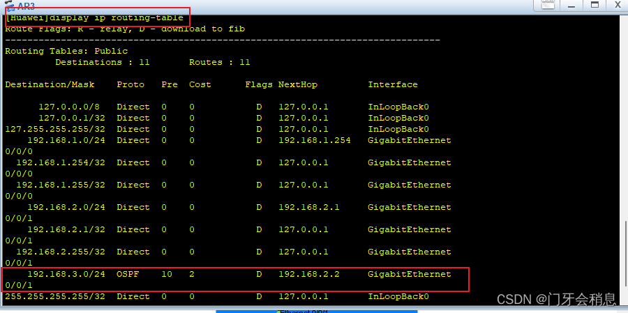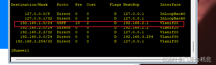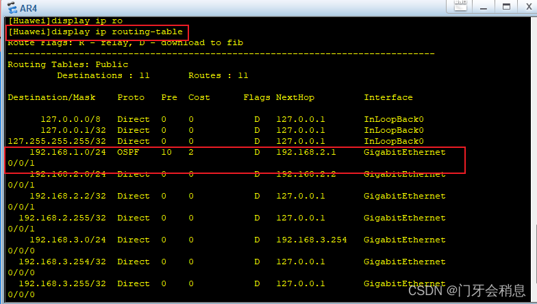 查看路由器中路由表信息,会多出一条OSPF的路由信息