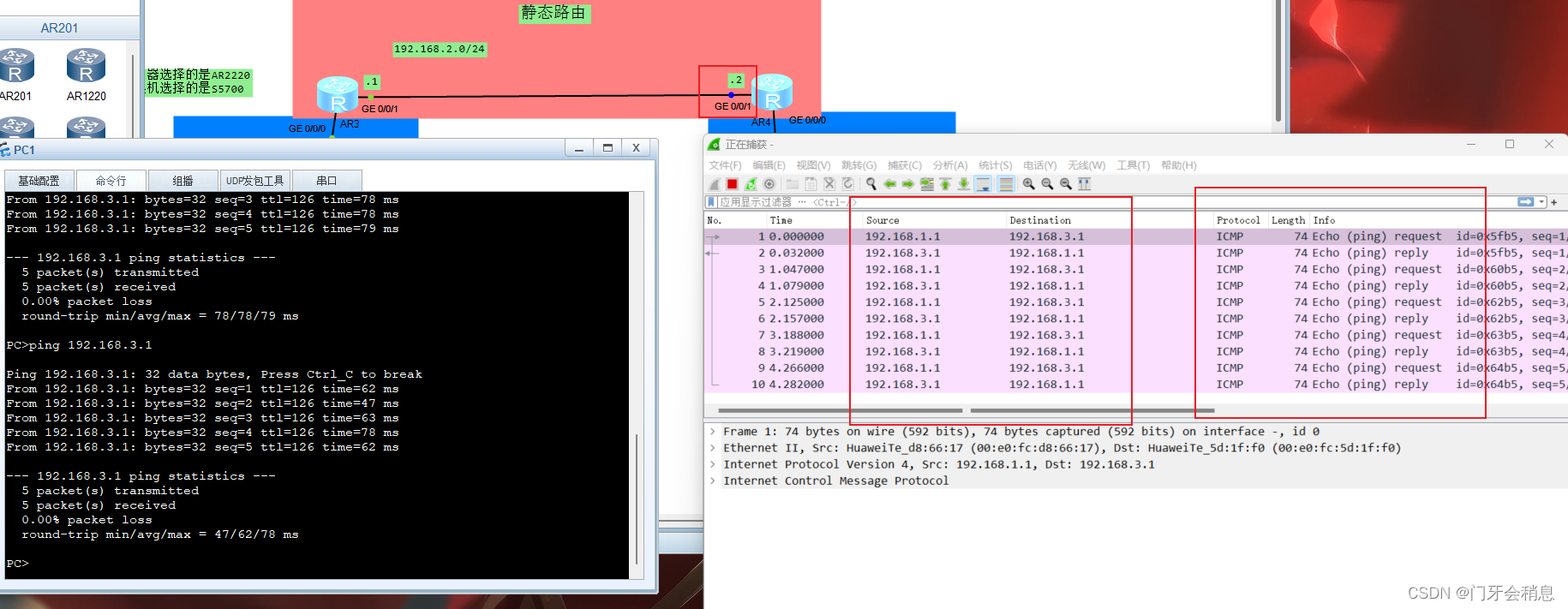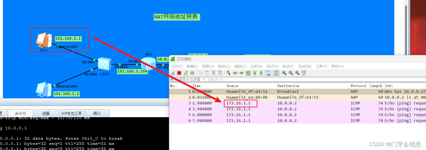 1、静态NAT:(将PC1对的ip地址转化成172.16.1.1,在AR2的G0/0/0端口进行抓包可以看得到地址转成了B类地址)