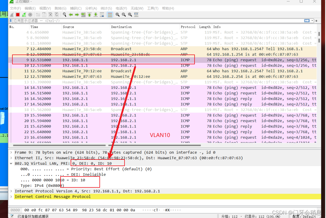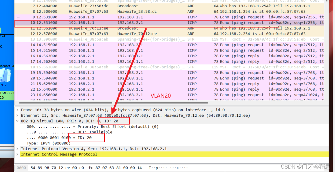 然后通过抓取路由器的端口数据包,PC1的数据会打上VLAN10的标签,PC2发送的数据会打上VLAN20的标签