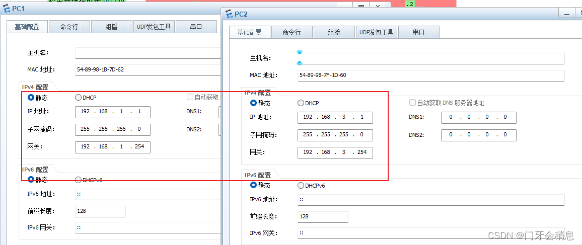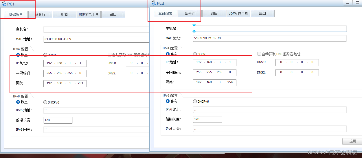 为了实现pc1(1网段)和pc2(3网段)可以通信,要给两个路由器分别配一条静态路由