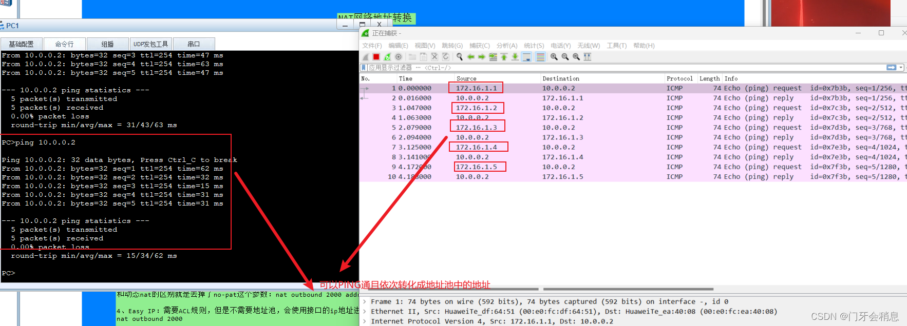 此时再用PC1去PING10.0.02,这时使用的IP就是地址池中的IP且可以PING通