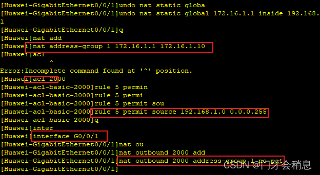 首先要删除AR1端口配置的NAT配置,否则会新创建失败。相比静态NAT,动态NAT需要地址池和ACL规则