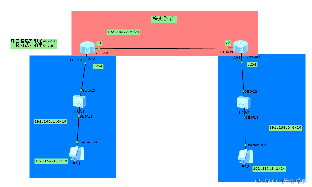 使用交换机为了实现不同网段之间的通信,可以设置静态路由,指明要到达的网络和到达该网络的下一跳IP地址(next hop)。在交换机中,静态路由通常用于配置简单的网络,其中网络拓扑相对稳定,不经常发生变化。